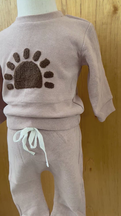 Incluye sweatshirt con detalle de sol en relieve y pantalón con cintura ajustable.