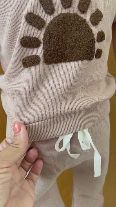 Este conjunto de dos piezas en tono beige con diseño de sol es todo lo que necesitas para un look relajado, moderno y lleno de estilo. Su tela acanalada es suave, cálida y perfecta para pieles delicadas, mientras que el diseño oversized ofrece libertad de movimiento y un toque chic sin esfuerzo.