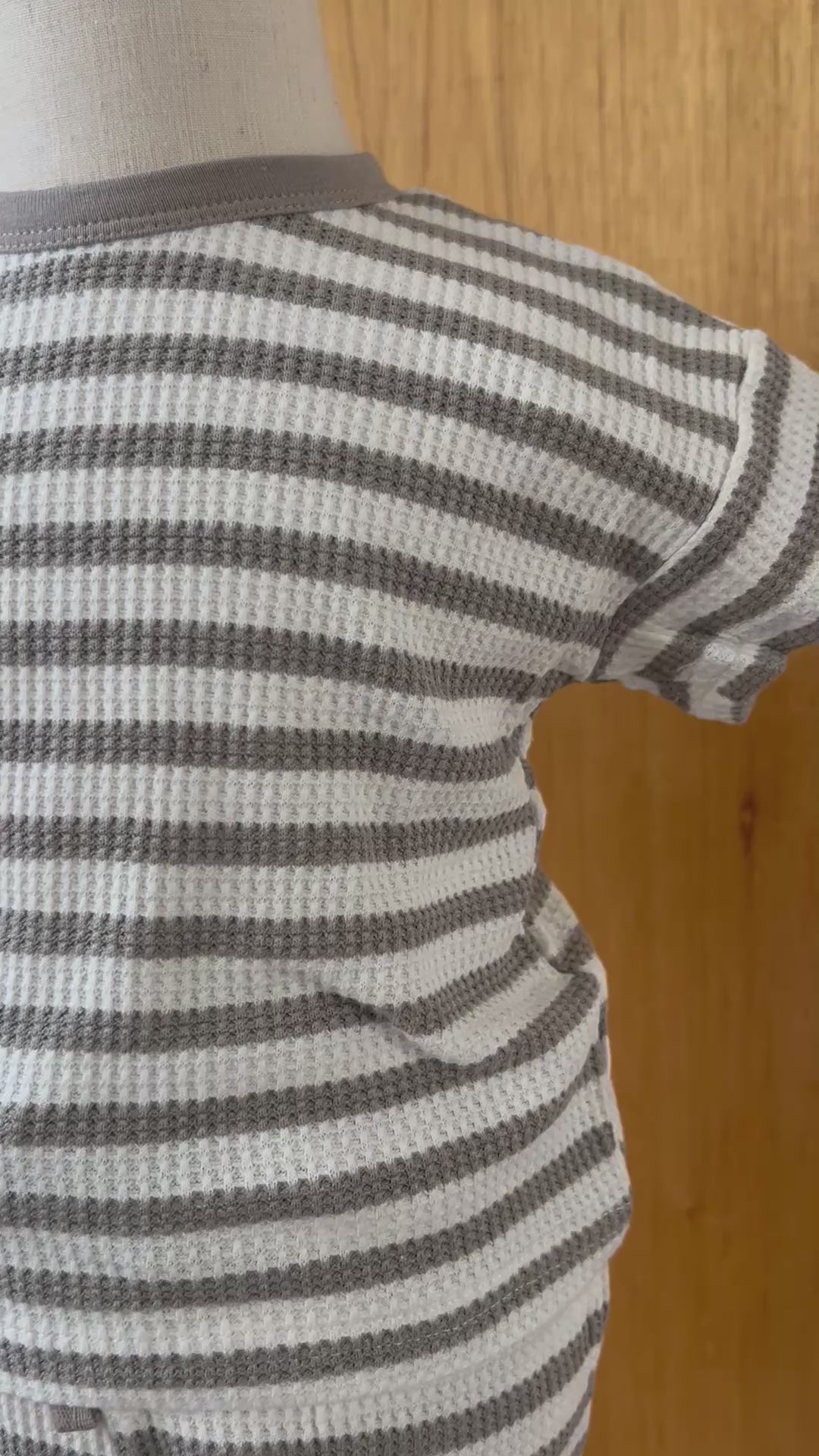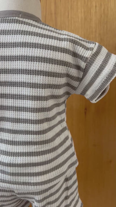 Este conjunto de dos piezas, compuesto por camiseta y pantaloncito corto con rayas beige y crema, es el aliado perfecto para los días calurosos. Su tela suave y ligera brinda total comodidad, mientras que el diseño minimalista lo hace moderno y fácil de combinar.