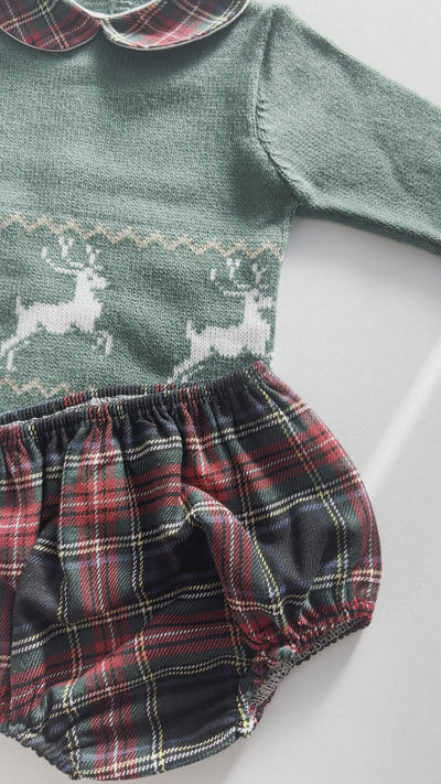 Pantalón corto tejido a mano de color verde reno con cuadrados multicolor.