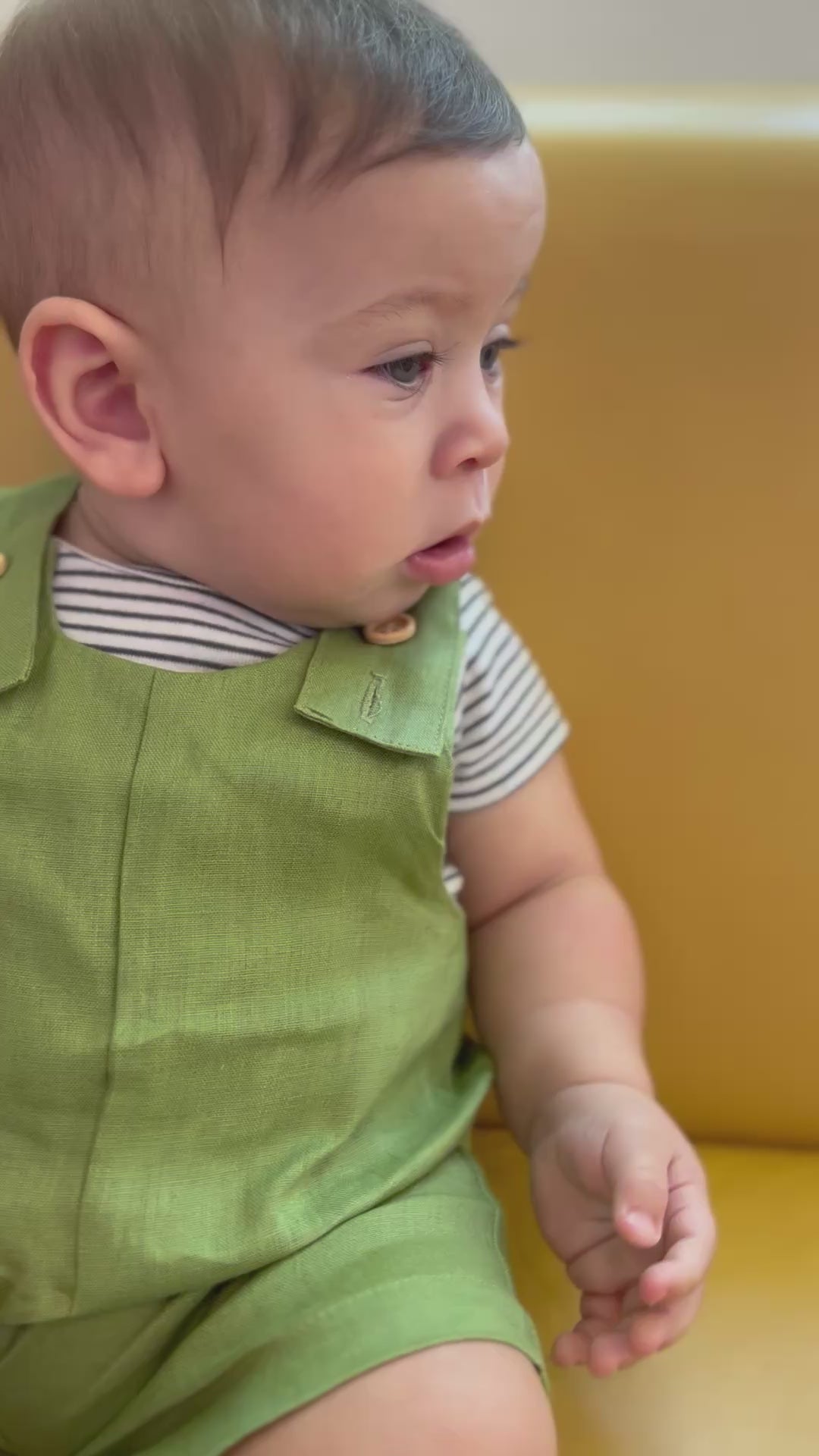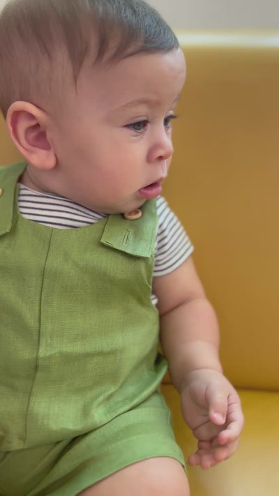 Mono de lino verde oliva hecho a mano , sin mangas y con botones en color crema.