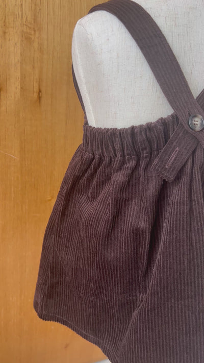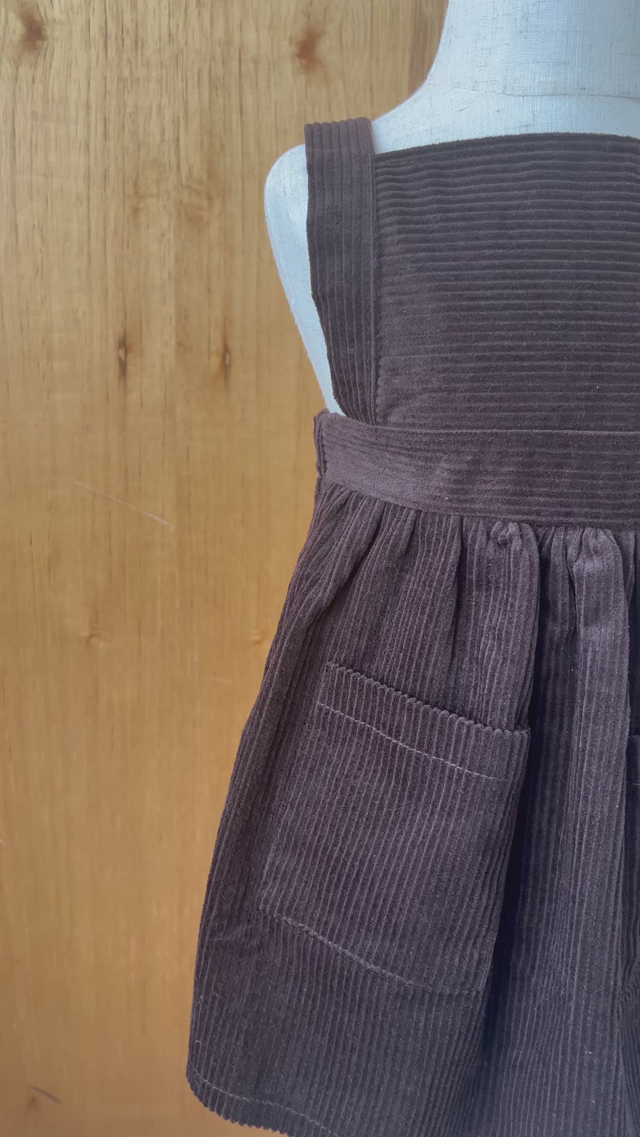 Este clásico vestido marrón es perfecto para cualquier ocasión. Confeccionado en pana sin mangas y con botones ajustables en la espalda, es versátil y cómodo. ¡Un look elegante y sencillo!