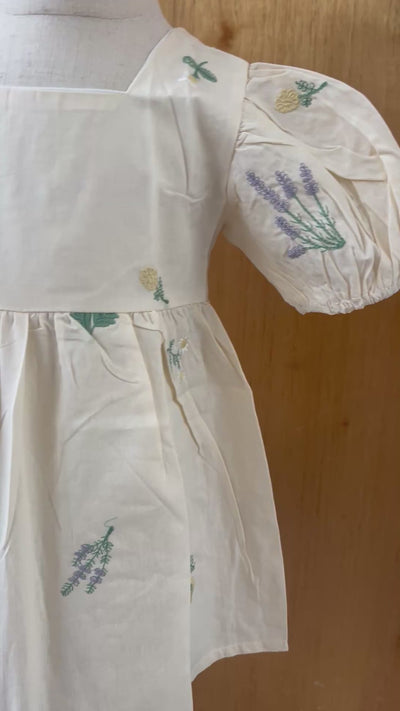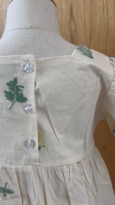 Este traje de algodón en tono crema con delicadas flores verdes es la combinación perfecta de dulzura, frescura y estilo. Su diseño con mangas abullonadas y escote cuadrado le da un detalle hermoso y encantador, ideal para sesiones de fotos, salidas especiales o simplemente para celebrar la belleza de lo simple.