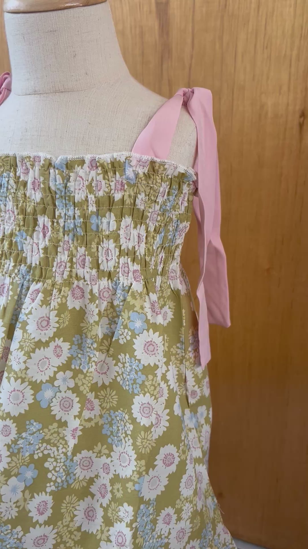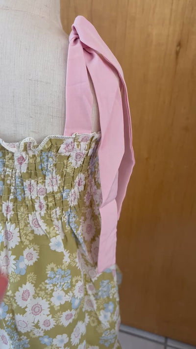 Este vestido es puro encanto: estampado floral en tonos suaves, tela liviana y lazos rosados en los tirantes para ajustarlo a la medida. El diseño con ruchas en el pecho y vuelo en la falda le da movimiento y frescura, ideal para días soleados, salidas especiales o simplemente para sentirse libre y feliz.